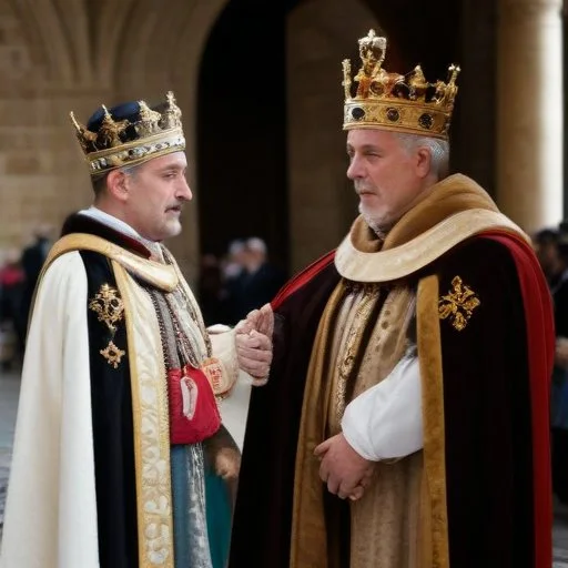 In the lush, fertile lands of Galicia, a majestic gathering took place, where the highest nobility, led by the esteemed Pedro Frilaz de Traba, and the influential bishop Diego Gelmrez, converged to bestow a grand honor upon Alfonso VII, proclaiming him the rightful King of Galicia. This crowning ceremony solidified Alfonso's position, marking a pivotal moment in the region's history, as the nobles demonstrated their allegiance and recognized his authority.